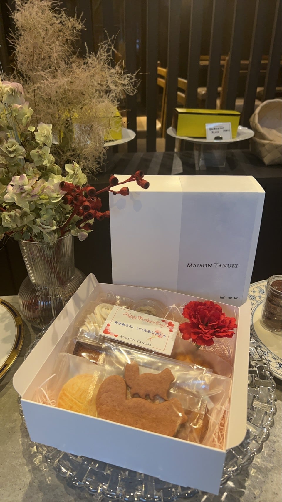 ■人気のマドレーヌ(2個)フィナンシェ(プレーン)、ガレットブルトンヌ、バニラメレンゲ、アールグレイのディアマンクッキー、おやこのたぬきクッキー(ココア)と多様なフレーバーをセットにしました。カーネーションのアーティフィシャルフラワー、メッセージカードを添えて。大切な方へのプレゼントにご利用ください。